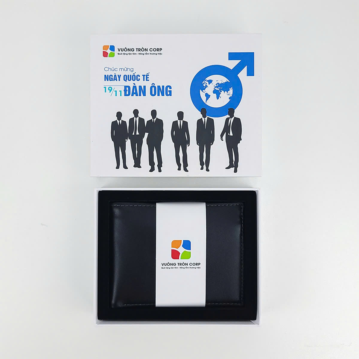 - Hộp quà: Hộp cứng định hình bế mút, in chủ đề “Chúc mừng Ngày Quốc Tế Đàn Ông 19/11” sang trọng, đồng bộ với thương hiệu.