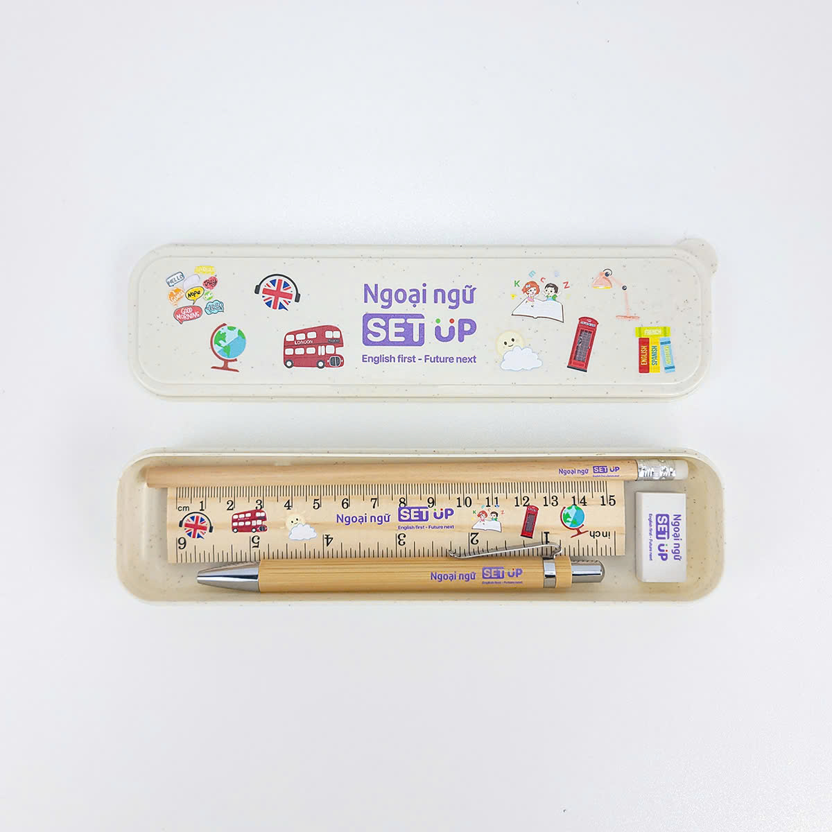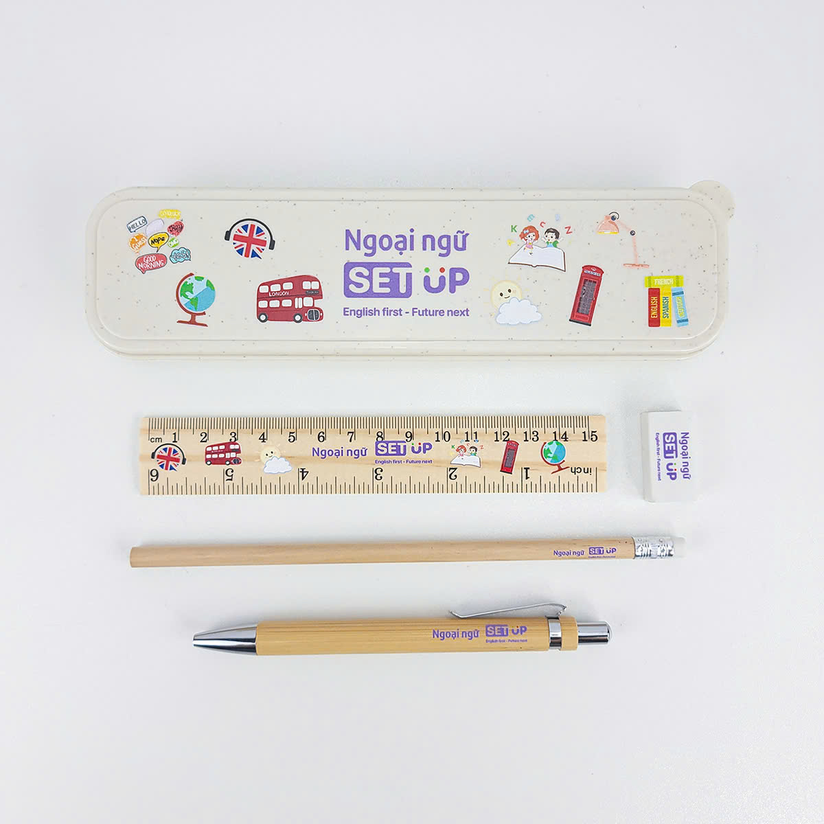 Bộ quà tặng giáo dục PS027 gồm: hộp bút, bút bi, bút chì, thước gỗ và gôm. Sản phẩm có thể in logo theo yêu cầu.