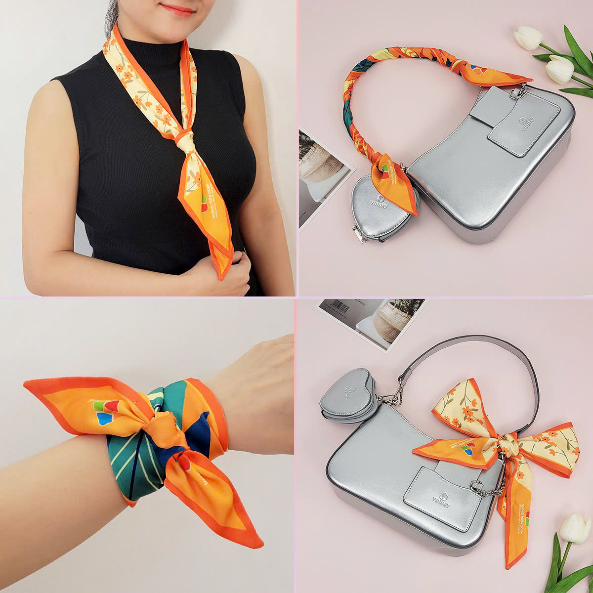 - Khăn lụa latin: Màu sắc tươi sáng, họa tiết nữ tính, dễ phối trang phục. Có thể dùng quàng cổ, buộc tay, buộc túi xách hoặc làm phụ kiện hằng ngày.