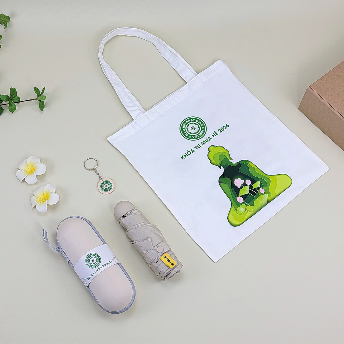 Set Quà Tặng Phật Giáo Túi Vải, Móc Khóa & Ô Dù In Logo
