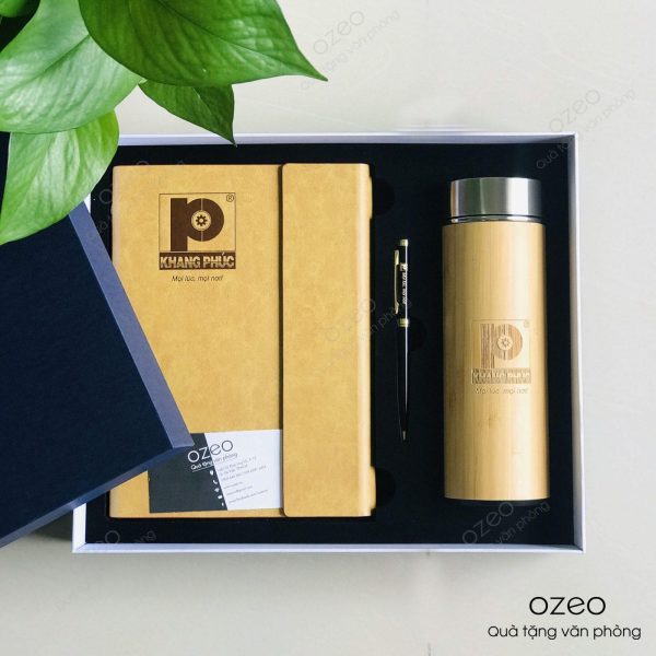 – Bộ quà tặng Giftset in logo theo yêu cầu bao gồm: 01 sổ tay bìa da PU, 01 bút kim loại và 01 bình giữ nhiệt.